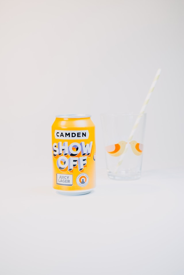 Or take the brand Camden’s Brewery and its beer flavor, “Show off.” The typography “show off” immediately leaps out on the can with its bold white and lilac font juxtaposed against a peach background.