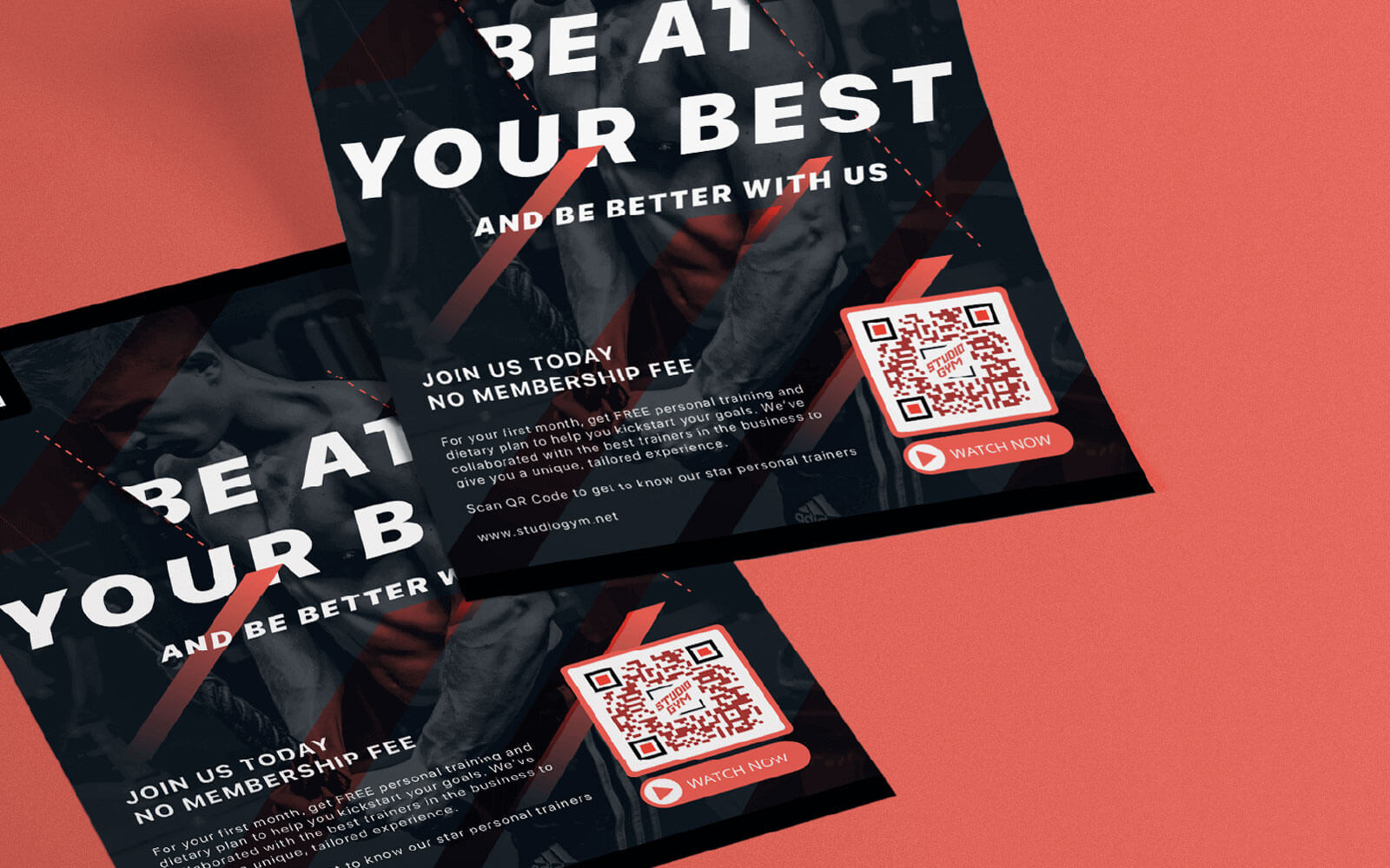 A physical pamphlet for a gym with a QR Code on it leading to a video about membership