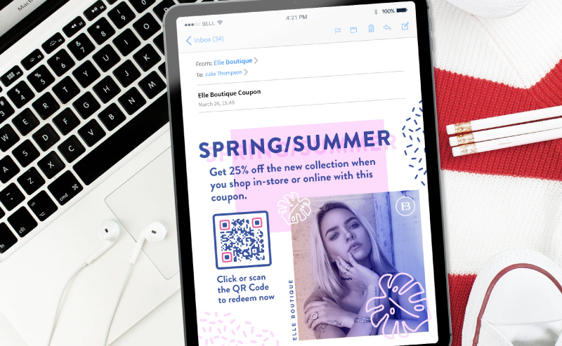 You can add QR Codes directly to email marketing campaigns. They’re particularly useful whenever you want to direct traffic to mobile platforms, as in the image above. An e-commerce retailer wanted to focus their email campaigns on their mobile app, so they used a Coupon QR Code to promote a discount for a new seasonal collection.