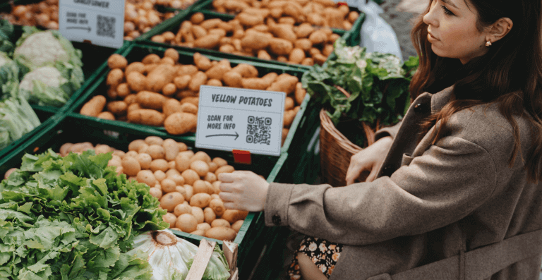 A woman standing next to a QR Code product label at a veggie stand.