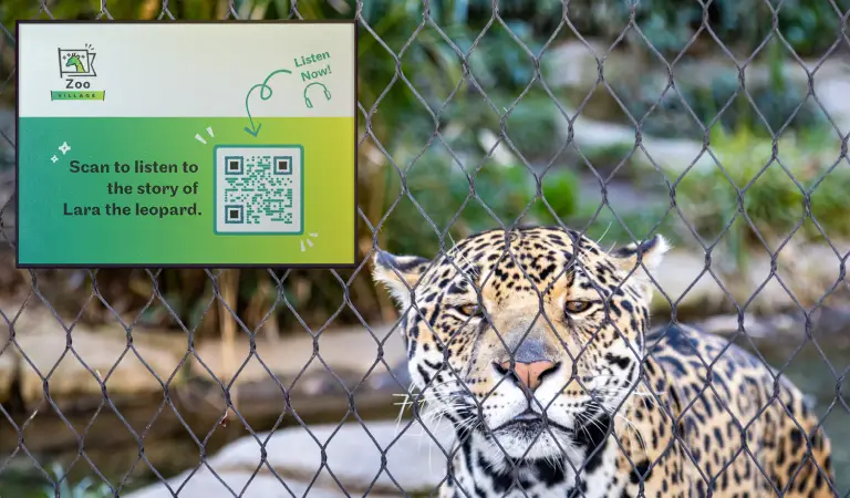 A sign with a QR Code displayed in front of a leopard in a cage.